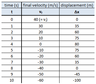 Now take a look at the data for a ball thrown upward at 40 m/s. Try to make sense of it.